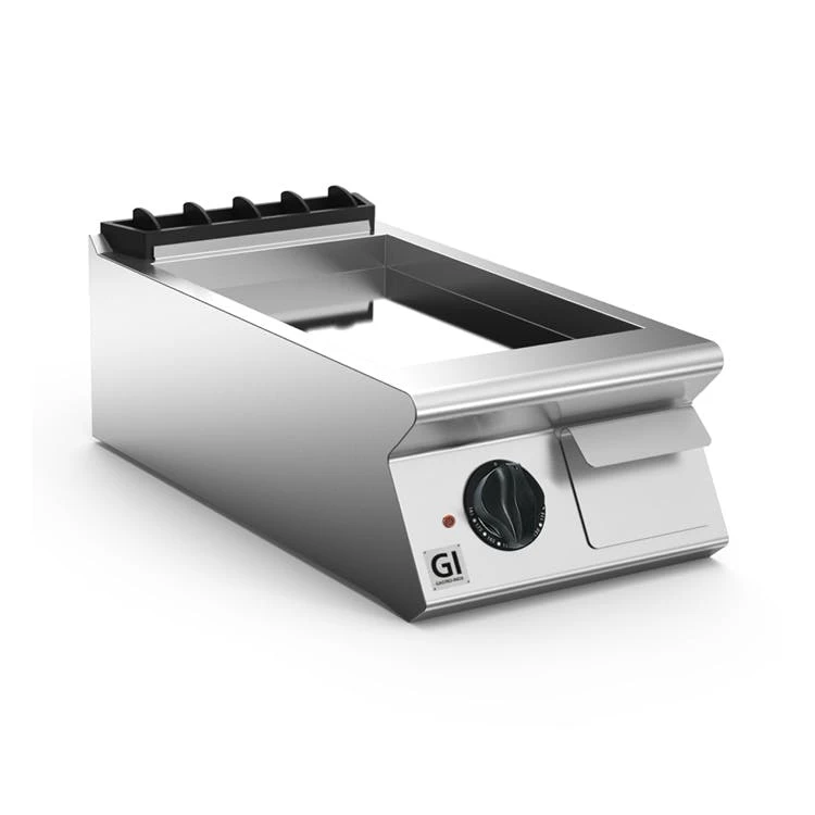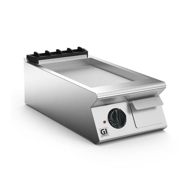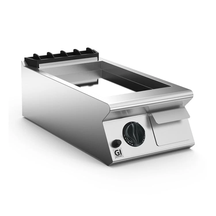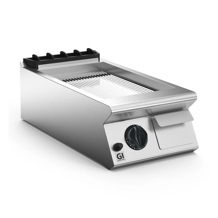 Gastro-Inox 700 “High Performance” Gas-Grillplatte. Die Grillplatte sind für Erdgas geeignet. Die Grillplatte sind in verschiedenen Oberflächenausführungen erhältlich, d.h. Edelstahl, Edelstahl und verchromt, aber auch glatt, komplett gerippt oder 2/3 glatt und 1/3 gerippt. Alle Grillplatte haben eine kurze Aufheizzeit, Piezozündung, eingebaute Auffangwanne, thermostatisch pro Zone einstellbar, thermostatisches Sicherheitsventil und sind leicht zu reinigen
