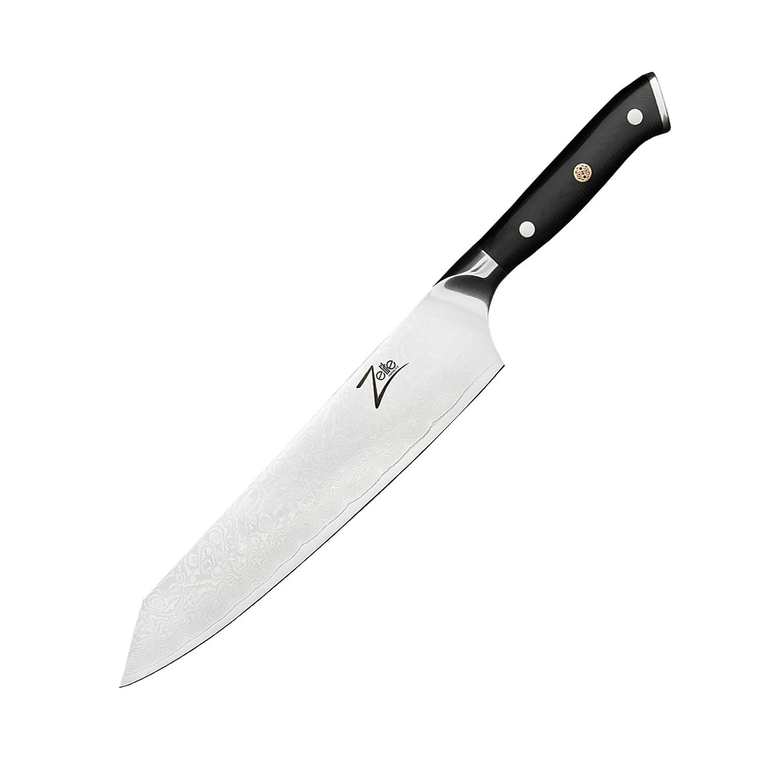 Exklusive Präzisionsmesser nach japanischem Vorbild: Die handgeschliffeneZelite Infinity by Klarstein Alpha-Royal Japanese Messerserie erfüllt hohe Ansprüche bei jeder Kochkunst. Insgesamt 67 Schichten bilden als hochwertiger, japanischer Damaszener-Stahl übereinanderliegend die changierende Klinge. Durch eine perfekt ausbalancierte und ergonomische Formgebung und einen nahtlosen, dreifach vernieteten Griff aus G10-Glasfaser liegen die eleganten Küchenwerkzeuge wunderbar in der Hand. Hier verbinden sich Schärfe, Haltbarkeit, Gewicht, Kontrolle und Handhabung mit außergewöhnlichem Design, perfektioniert durch eine kunstvolle 3-Metall-Mosaikniete im Griff.