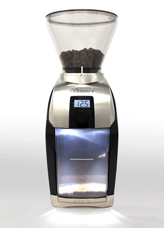 Baratza Virtuoso+. Leistung: 70 W, AC Eingangsspannung: 100-120 V, AC Eingangsfrequenz: 50/60 Hz. Gewicht: 3,6 kg, Breite: 120 mm, Tiefe: 160 mm