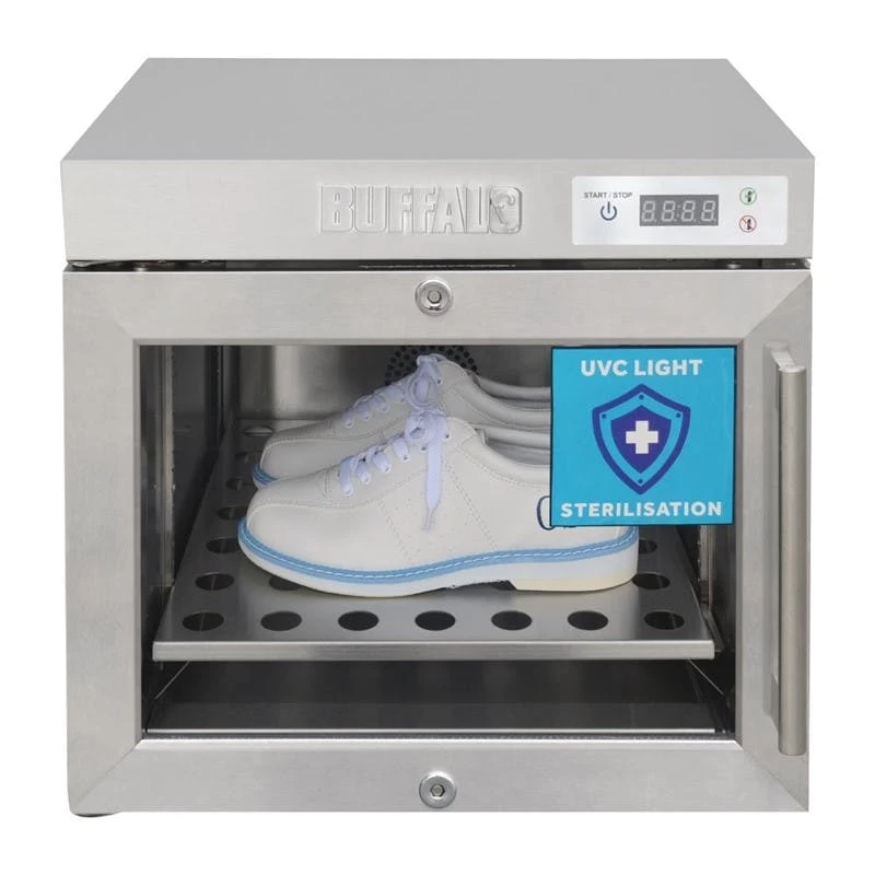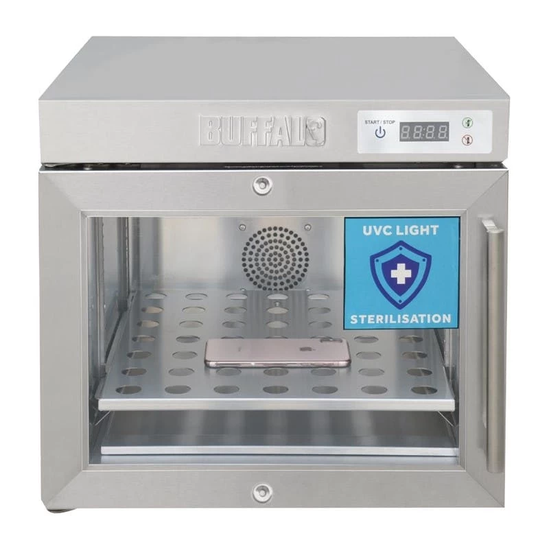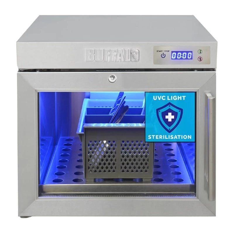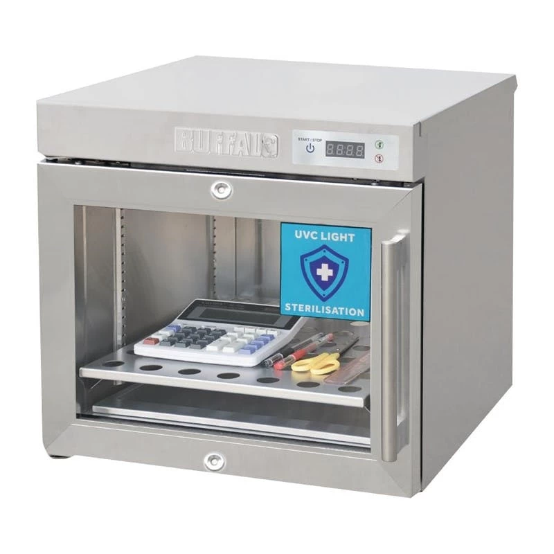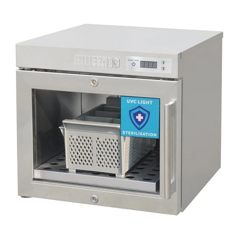 Äußerst vielseitig – sterilisiert Gläser, Geschirr, Besteck, Brillen, Schlüssel, Utensilien usw.Einzelne, leicht austauschbare UVC-Lampe. UVC-Wellenlänge: 254nmTür aus gehärtetem Glas – einfacher Blick auf den Inhalt ohne ÖffnenInnenabmessungen: 288(H) x 369(B) x 409(T)mmEinfache digitale Timer-Steuerung – 30 Minuten SterilisationszykluszeitFarbcodefunktion – grün für ok/go, rot für Tür geschlossen haltenVerstellbare Anti-Rutsch-Füße für eine einfache Installation2 Sätze verstellbarer Führungen ermöglichen eine flexible BeladungLeicht zu reinigendes Design mit herausnehmbarer interner TropfschaleAuffälliges blaues Innenlicht leuchtet auch dann, wenn kein Sterilisationszyklus läuftGeliefert mit Glasablage und BesteckkorbAbschließbar für zusätzliche Sicherheit und SchutzDie Sterilisatoren verwenden geprüftes UV-C-Licht mit einer Wellenlänge von ca. 254 nm, um Bakterien und Viren wirksam abzutöten, und zwar ohne scharfe Chemikalien oder hohe Temperaturen.Produktart: SterilisiermaschinenMaterial: 430 EdelstahlGewciht: 18,1kg