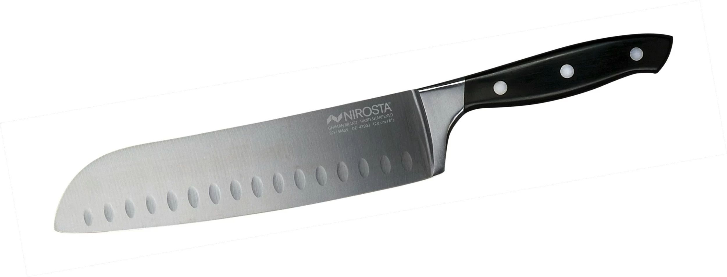 Santokumesser mit Wellenschliff für Schnittgut mit harter Außenschale, geschmiedete Klinge aus Chrom-Molybdän-Vanadium (DIN X50CrMoV15), vernieteter und verschweißter Griff aus POM-Kunststoff, spülmaschinengeeignet, in der Form der japanischen Santokumesser, universell einsetzbar, gut nachschleifbar