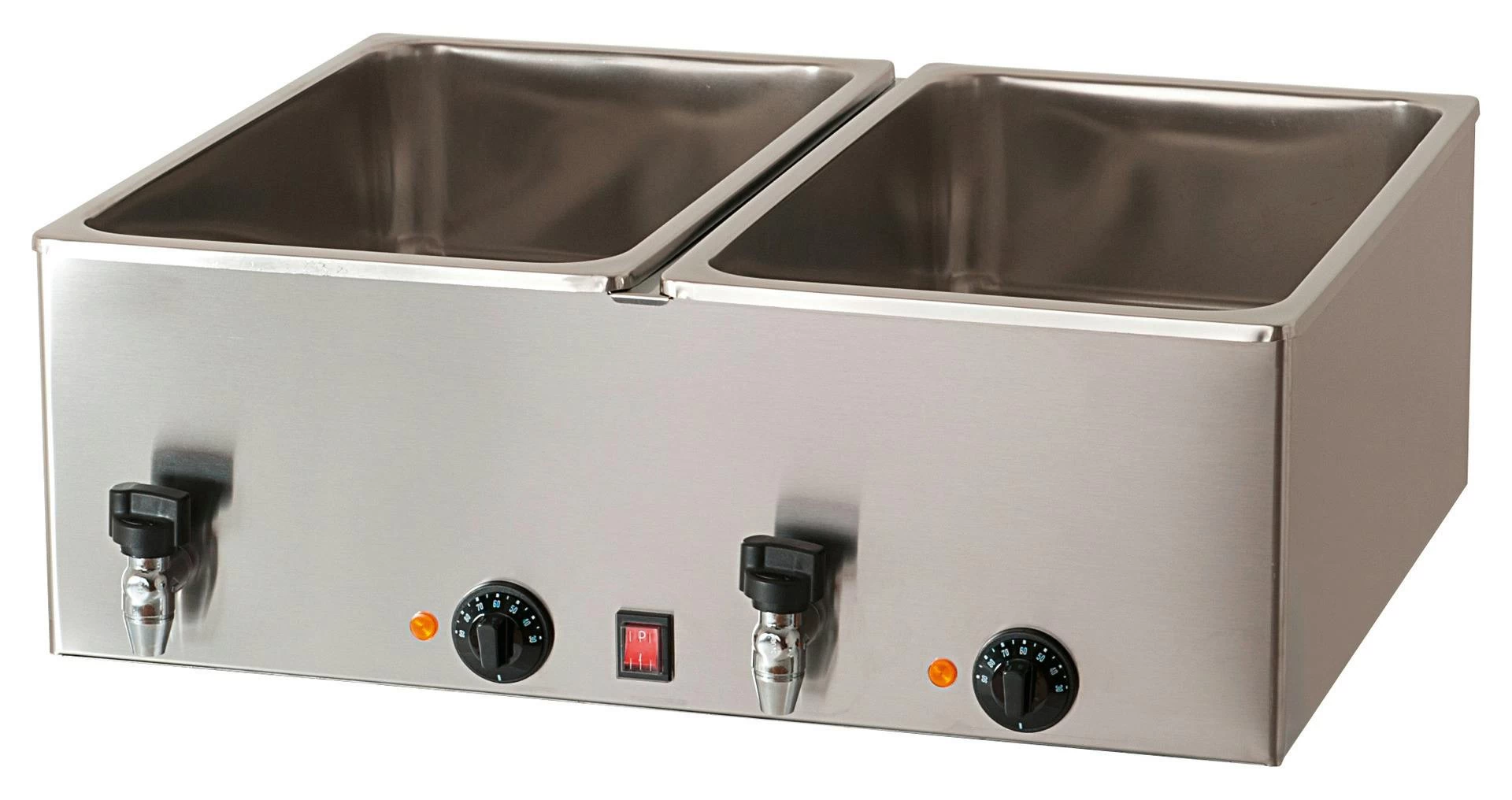 > 1 Becken, GN 1/1, H=200 mm > Korpus aus Edelstahl > mit Ablaufhahn > leistungsstarke Heizplatte unter der Wanne > verhindert anbrennen bei Wassermangel > Temperaturbereich: 0°C bis 90°C