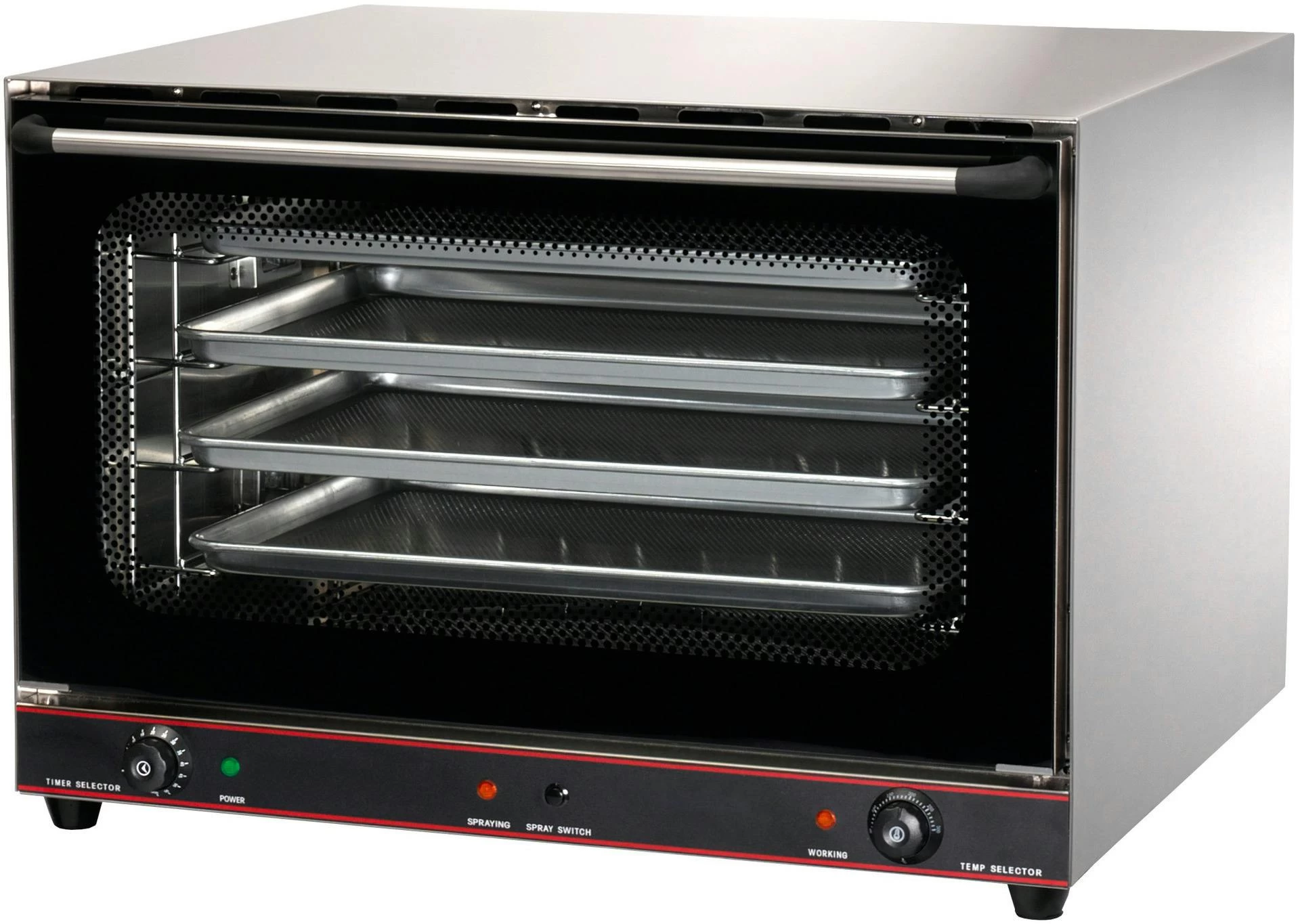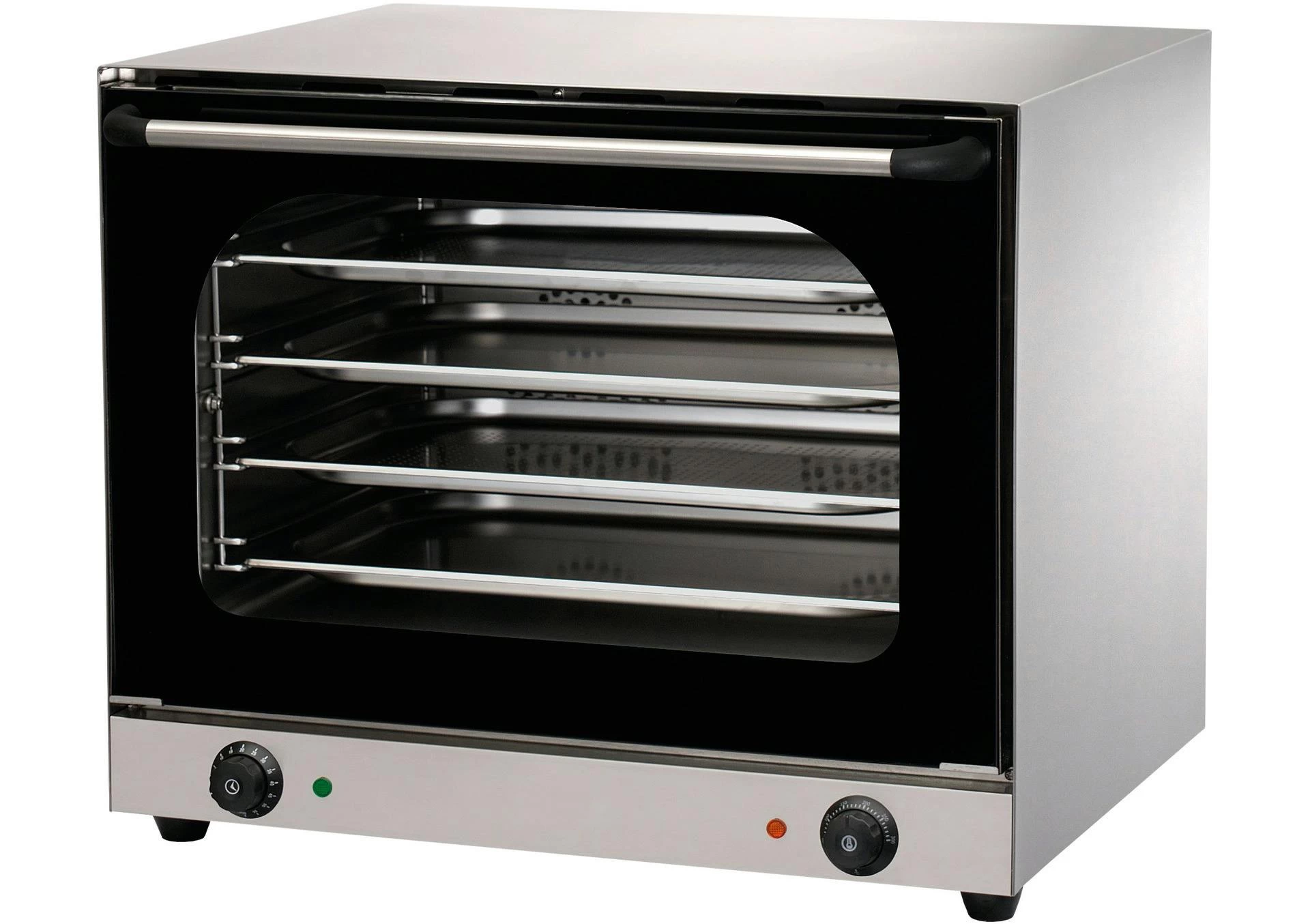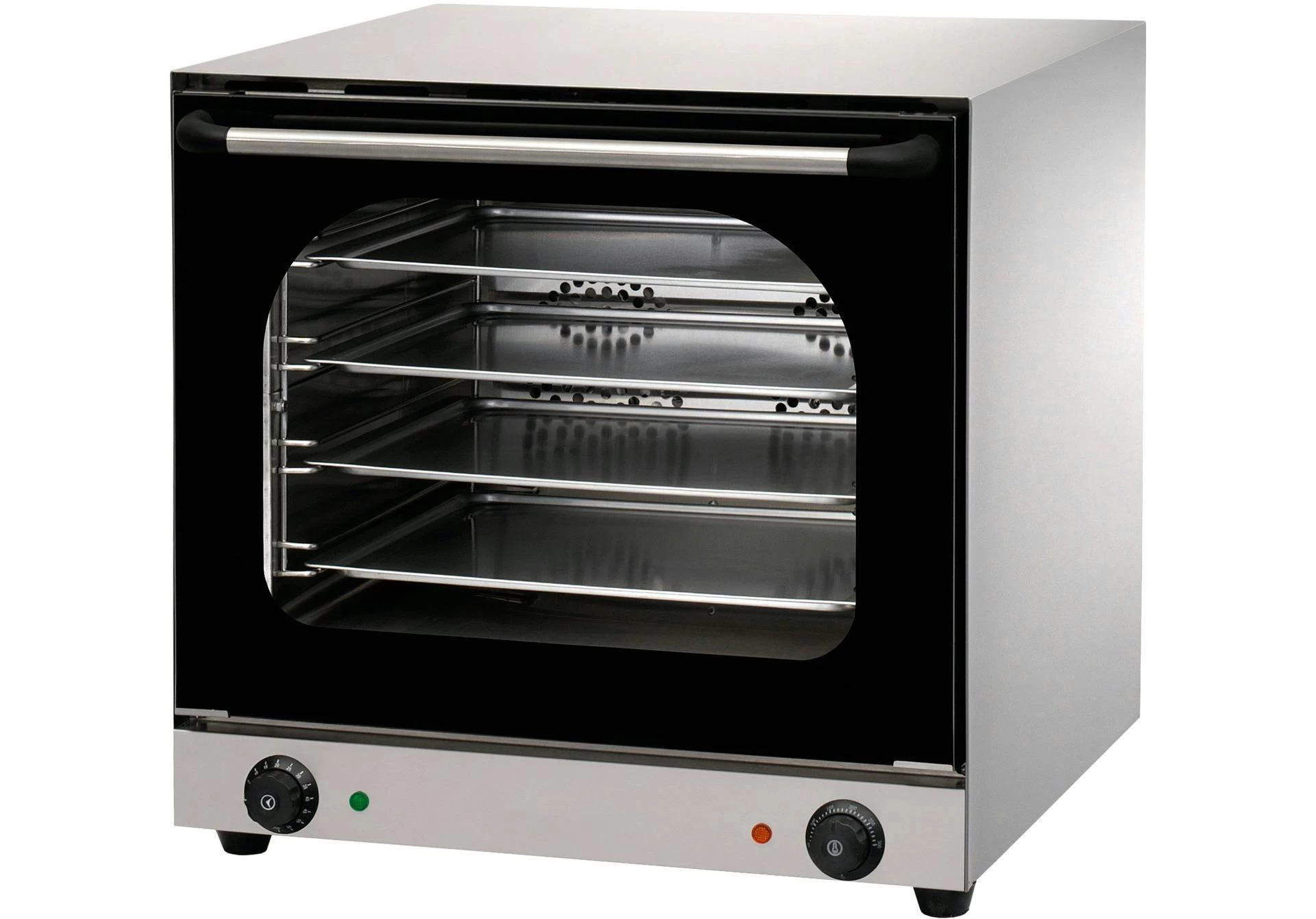 > Außenmaterial Edelstahl > Tür aus hitzebeständigem Glas > Temperaturbereich 50°C bis 300°C > mechanisches Thermostat > mit manuellem Timer > mit Innenbeleuchtung > inkl. 4 Bleche 435 x 315 mm