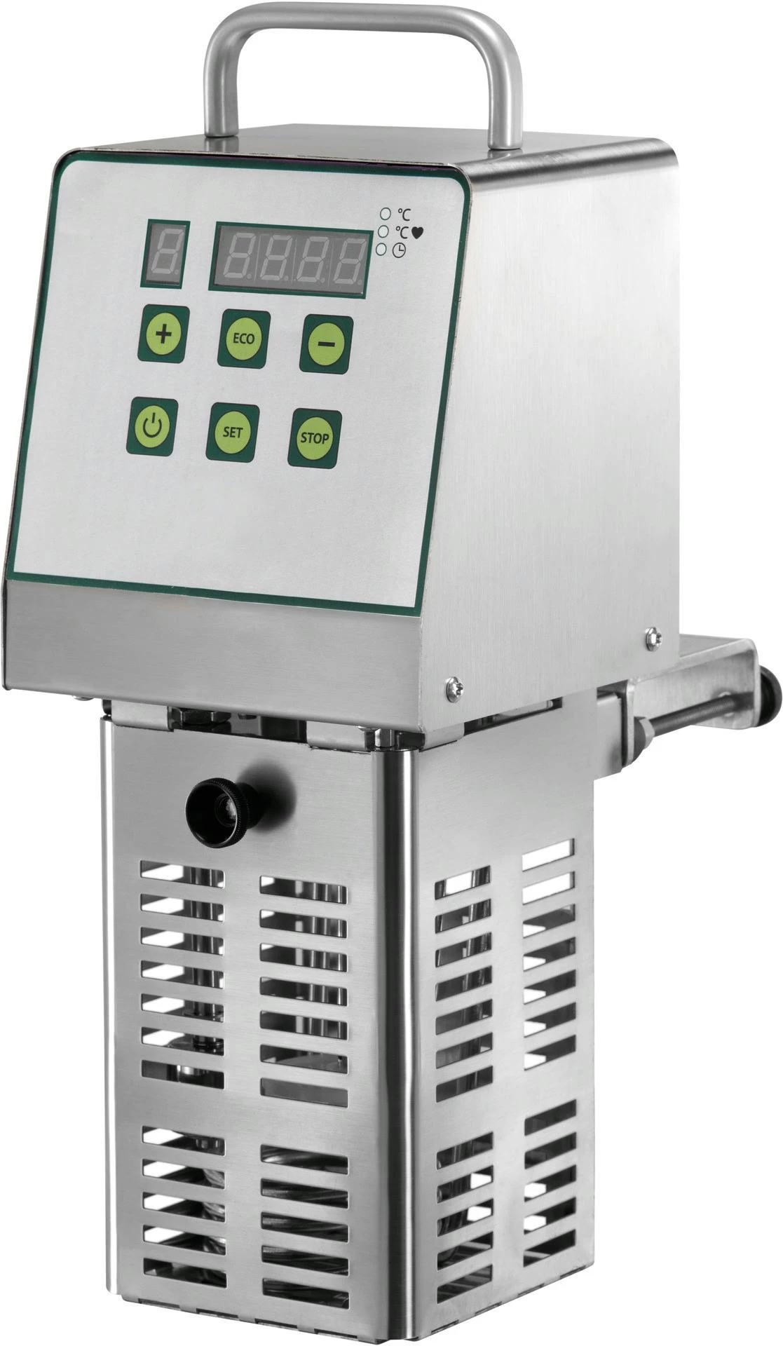 > Gerät zum Vakuumgaren> für GN Behälter bis 50 l (nicht enthalten)> Korpus aus Edelstahl> Steuerung mit 5 Garprogrammen> Display für Wassertemperatur, Kerntemperaturfühler und Timer> Stop bei fehlendem Wasser> Lieferung ohne Kerntemperaturfühler