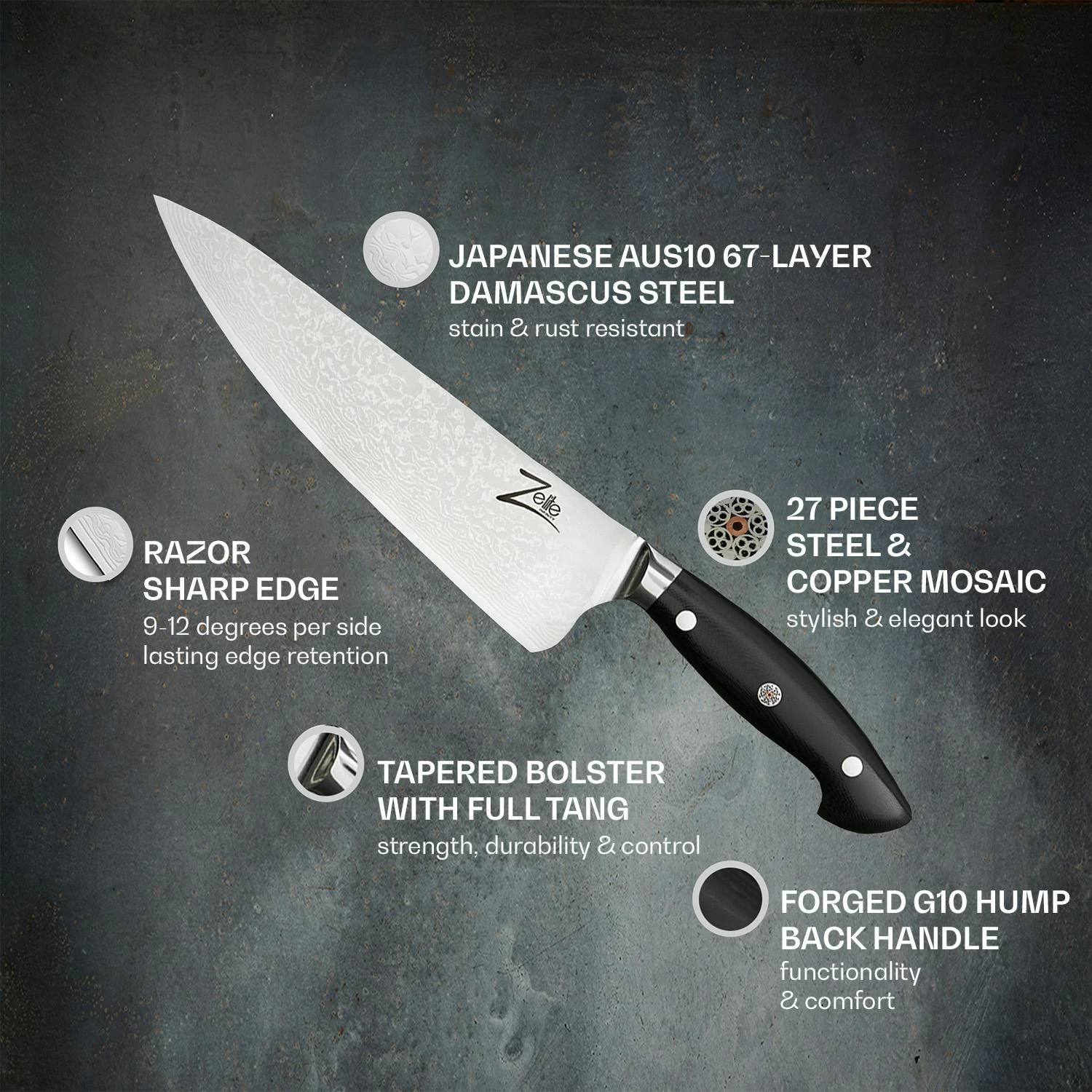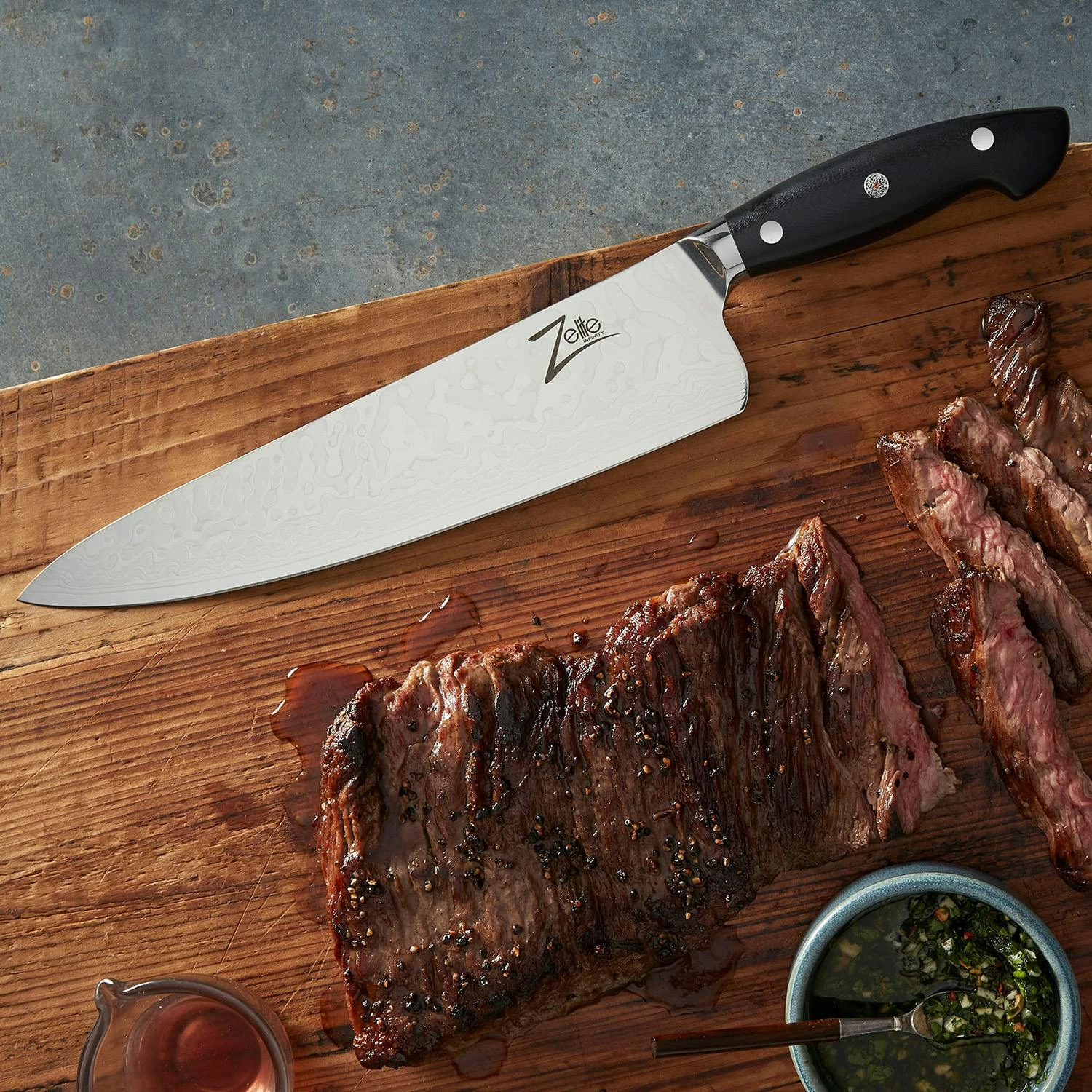 Unser 8` Kochmesser der Executive-Plus Serie von Zelite Infinityby Klarstein besitzt eine 45-lagige Damastklinge, einen gebogenen Bauch und einen wunderschönen, ergonomischen G10-Griff mit Buckelrücken. Wir haben einen glatten, konisch zulaufenden Kropf hinzugefügt, der für den vom Küchenchef bevorzugten Kneifgriff und das Schneiden mit schaukelnden Bewegungen maßgeschneidert ist. Ob du Zwiebeln würfeln, Schweinefilet filetieren, Karotten in Julienne schneiden oder Basilikum in Chiffonade hobeln möchtest – mit dieser professionellen Klinge ist es Liebe auf den ersten Schnitt.