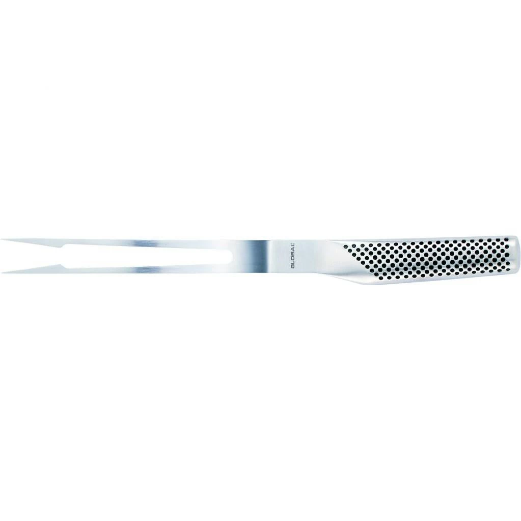 Die Global Bratengabel G-13 Global Kochwerkzeug Bratengabel geschwungen ist mit ihren geschwungenen Zinken unverzichtbar zum Wenden von Bratgut in der Pfanne oder im Ofen. Mit ihr lassen sich Bratenstücke einfach und leicht umdrehen. Die Bratengabel verfügt über zwei gebogene lange Zinken, mit denen man auch dickere Stücke gut gewendet kann. Die leicht gebogene Form verringert dabei das Risiko, dass Fleisch beim Wenden von der Gabel rutscht. Auch die G-13 Global Yoshikin Bratengabel geschwungen von Global ist aus Cromova 18 Stahl gefertigt und daher sehr stark. Der ergonomische Griff mit den charakteristischen kleinen schwarzen Pünktchen ist mit Sand gefüllt. Dadurch ist die Bratengabel perfekt ausbalanciert und liegt gut in der Hand. Als Tranchiermesser empfehlen wir das G-03 Global Yoshikin Fleischmesser.