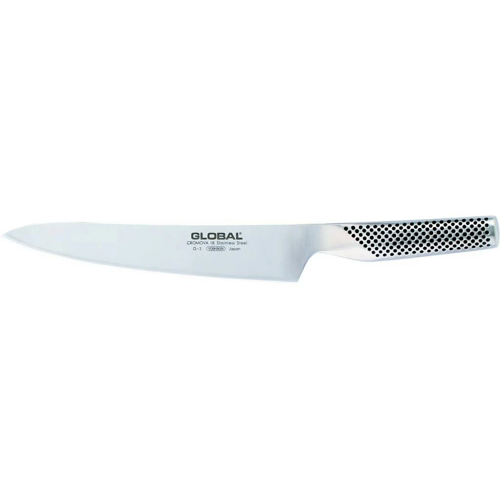 Vielleicht hat Ihnen das G-01 Fleischmesser von Global nicht so ganz zugesagt, weil dessen Spitze abgerundet ist. Sind Sie eher der spitze Typ, dann dürfte das G-03 Global Yoshikin Fleischmesser genau richtig für Sie sein. Die Klinge ist hier spitz zulaufend und mit einer Klingenlänge von 21 cm ist dieses Messer der ideale Partner zu Ihrer Tranchiergabel. Mit dem G-03 können Sie das Tranchieren Ihres Festtagsbratens vor den Augen Ihrer Gäste zelebrieren. Jede Bratenscheibe wird ein akkurat geschnittenes Meisterstück.