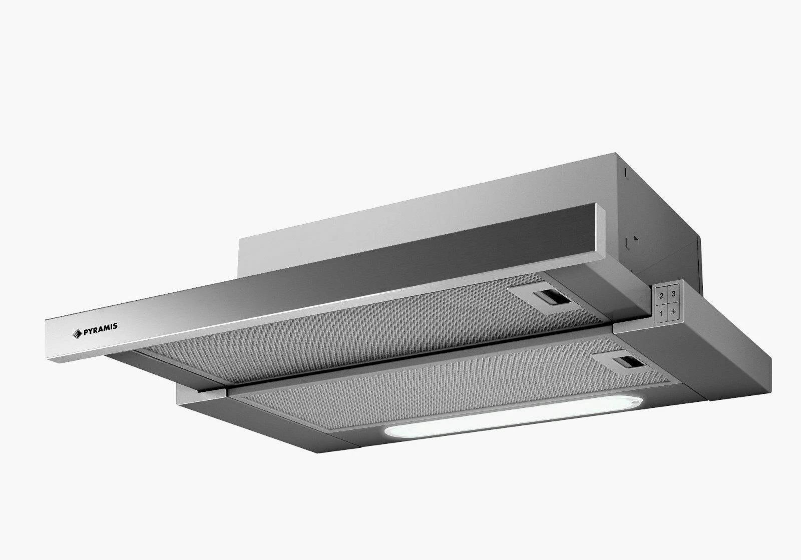 Unterbau Dunstabzugshaube aus weiß lackiertem Edelstahl mit spülmaschinenfestem Metallfettfilter.