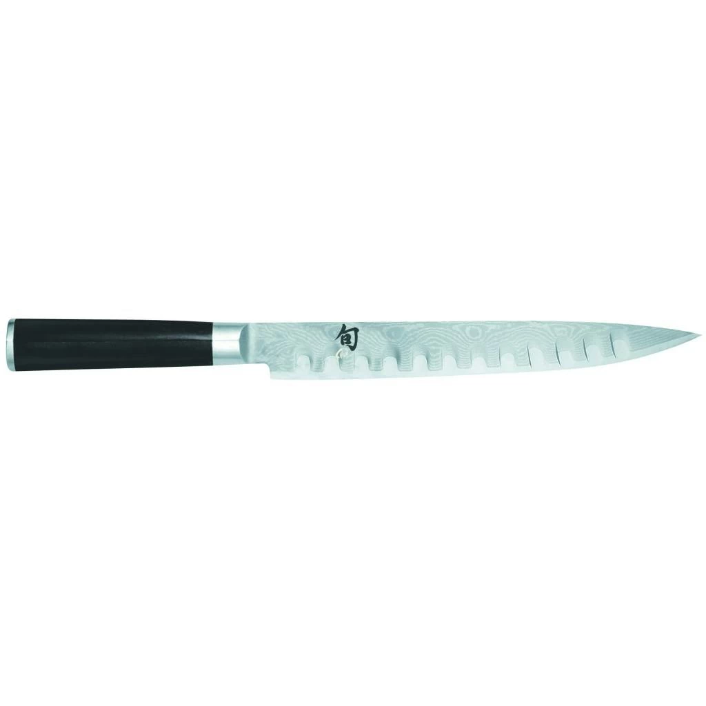 Als renommierte japanische Messerschmiede ist KAI geradezu verpflichtet in seiner Shun Serie auch ein Santoku mit Kullenschliff anzubieten. Mit dem KAI Shun Santoku mit Kullenschliff DM-0718 erhalten Sie ein echtes Drei-Tugenden-Messer (für Fisch, Fleisch und Gemüse). Die muldenartigen Vertiefungen auf der Klinge nennt man Kullen. Beim Schneiden sorgen sie dafür, dass stellenweise Luft zwischen die Klinge und das Schneidgut kommt. Auf das Schneidergebnis hat dies keine nachteiligen Auswirkungen. Aber beim Schneiden haftet durch die kleinen `Luftpolster“ insbesondere sehr feuchtes Schneidgut deutlich weniger an der Klinge an. Dieses Santoku-Messer hat eine Klingenlänge von 16,5 cm und ist wie alle anderen Klingen der Shun Serie 32-lagig nach Damaszener Art geschmiedet. Der laminierte Pakkaholz-Griff harmoniert hervorragend mit der im japanischen V-Schliff zweiseitig geschliffenen Klinge.