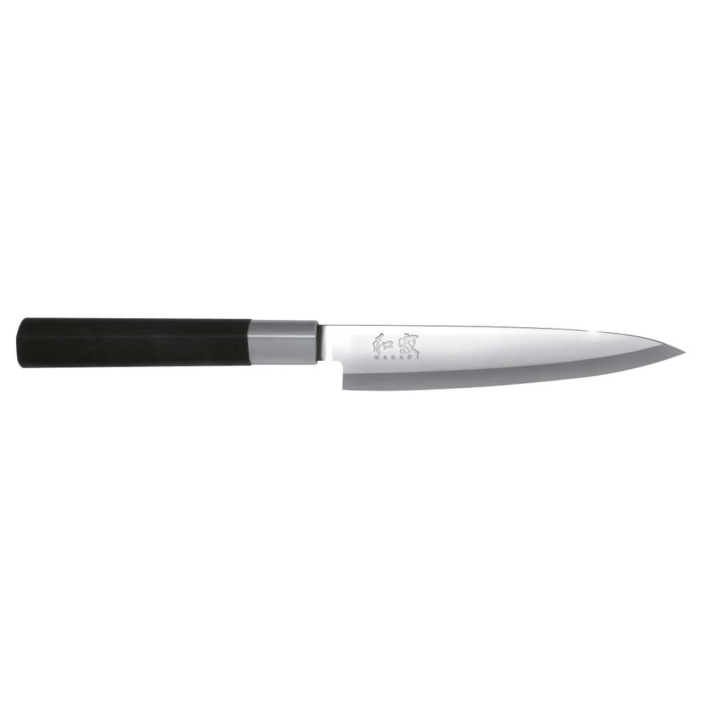 KAI Wasabi Black – polierte Klinge, schwarzer Griff: Die in Japan entwickelten Messer, mit einer rostfreien polierten Edelstahl-Klinge mit 58±1 HRC Härte, geben Ihrer Küche ein unverwechselbares, fernöstliches Flair. Für die Wasabi-Reihe wurde ein Griff entwickelt, dessen besondere Kombination aus Bambuspuder und Polyphropylen optimale Hygiene bietet – auch durch die natürlich antibakterielle Wirkung der Bambusanteile. Der schwarze Griff ist im Gegensatz zum traditionellen japanischen Holzgriff nicht gesteckt, sondern umschließt die Klinge komplett, so dass die Klinge fest mit dem Heft verbunden ist und sich zum anderen kein Schmutz einlagert – Großküchentauglichkeit garantiert.