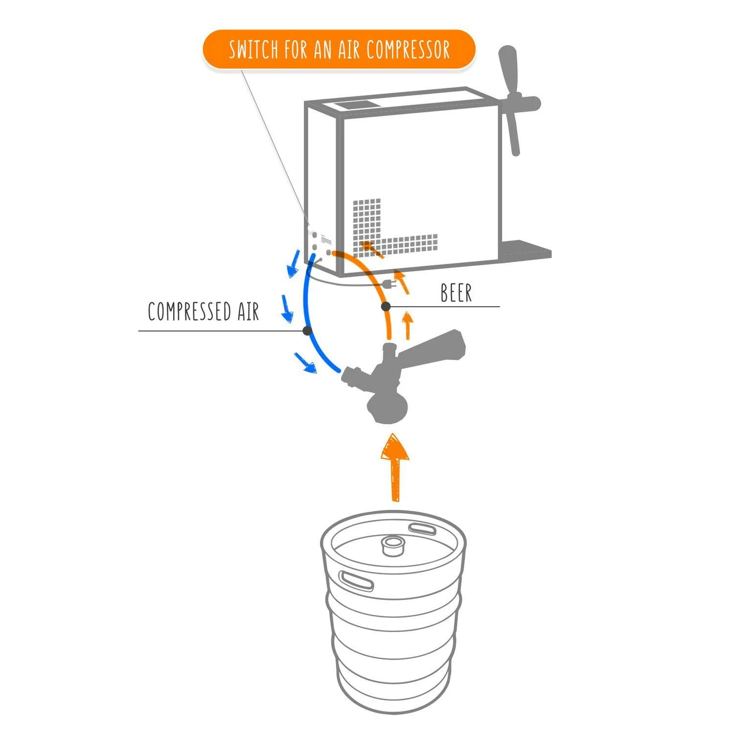 - Der Kühler wird ohne Kohlensäure betrieben, durch die Membranpumpe wird der Druck im Fass aufgebaut.