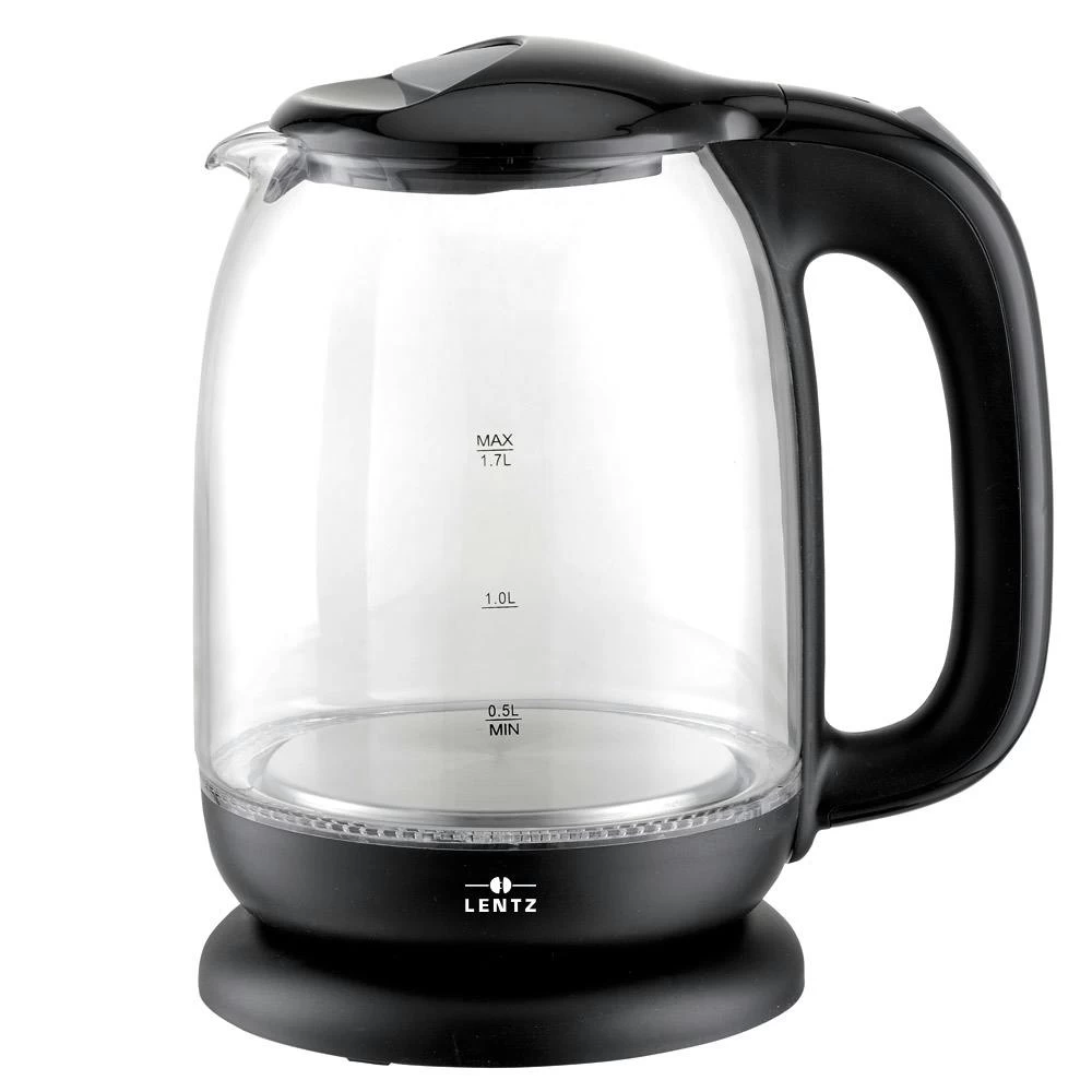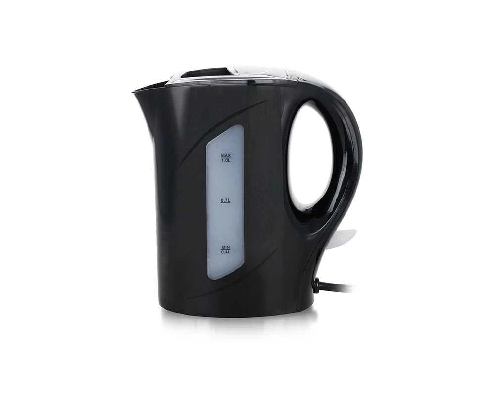 Wasserkocher aus Kunststoff mit Sicherheitsverschlussdeckel sowie automatischer und manueller Abschaltung.