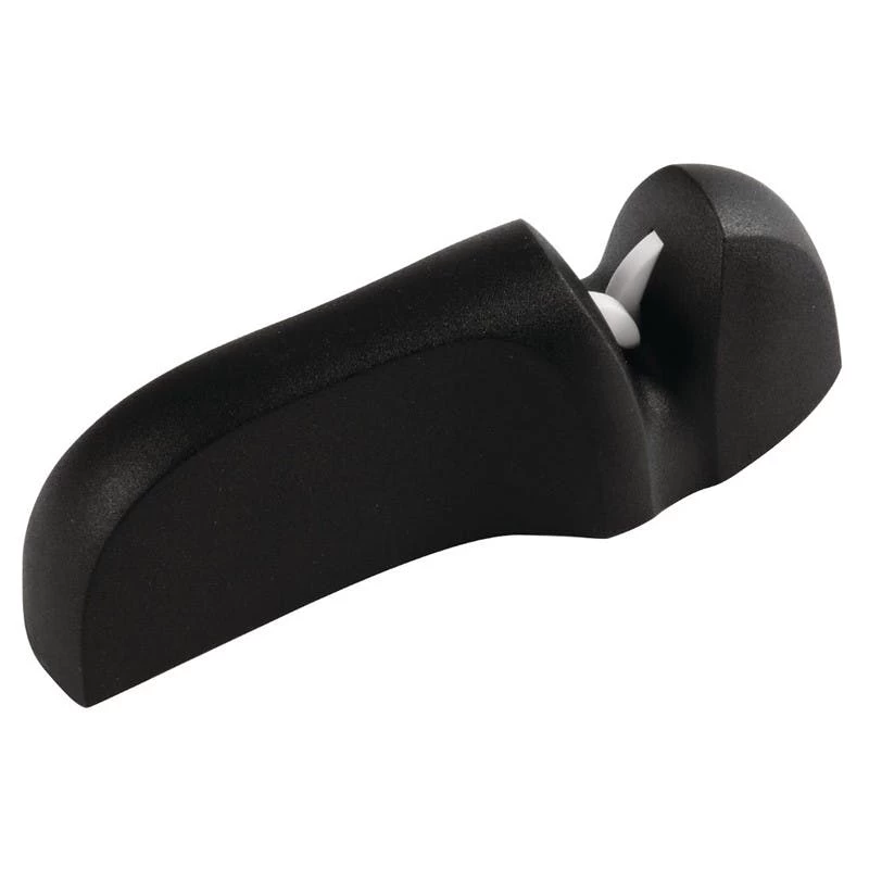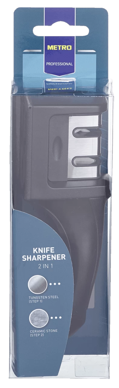 Der METRO Professional 2 in 1 Messerschärfer (in Schwarz) hat ein Nettogewicht von 125 g. Das Produkt besteht aus ABS Kunststoff, Wolframstahl und Keramik. Der Wolframstahl Stufe ist für das Schärfen und der Keramikstein Stufe ist für das Finish geeignet.