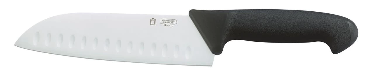 Das METRO Professional Santokumesser mit einer Klinge aus Molybdenum-Vanadium-Stahl ist leicht zu schärfen und verfügt über einen ergonomischen Griff. Das Messer hat ein Gewicht von 163,5 g und eine Länge von 180 mm.