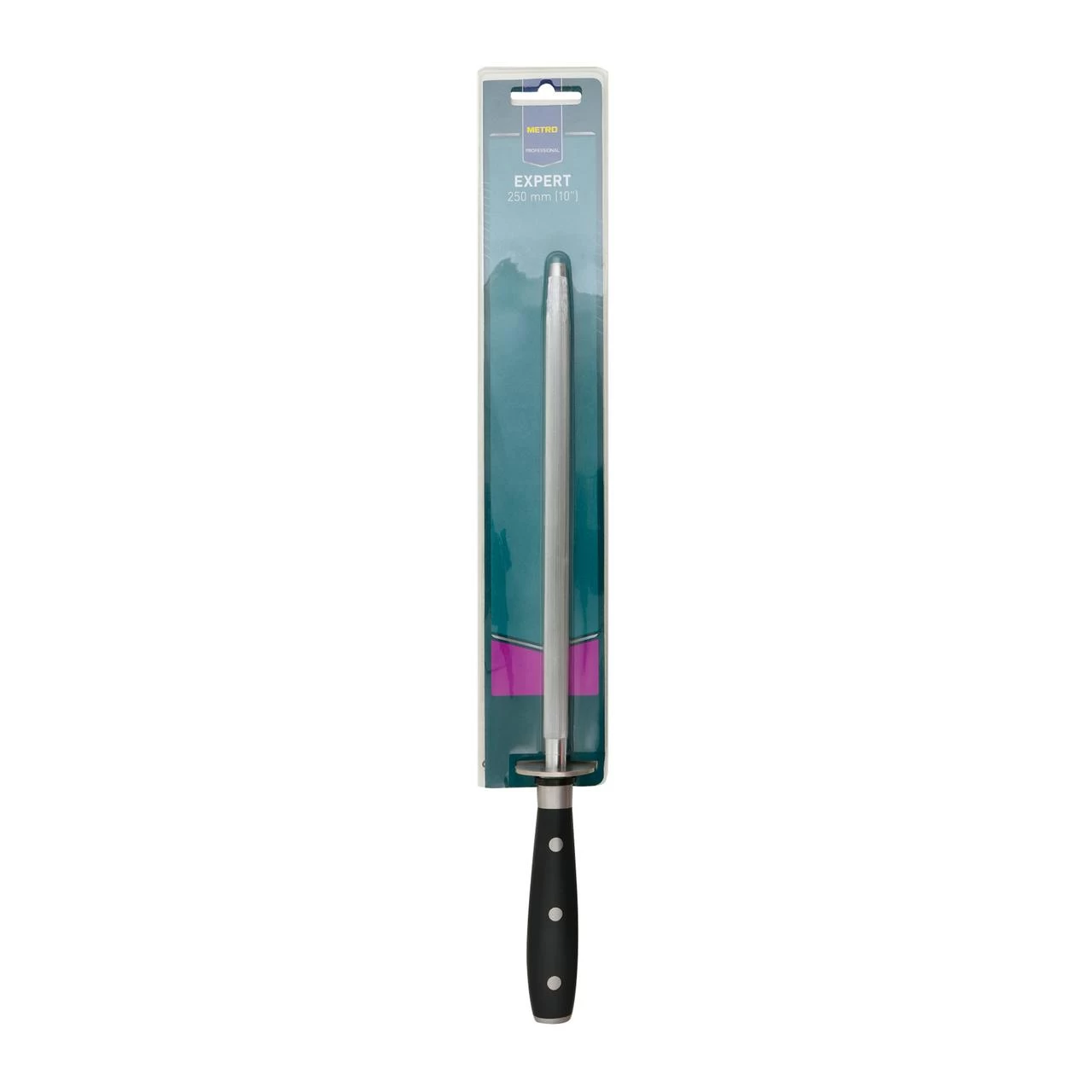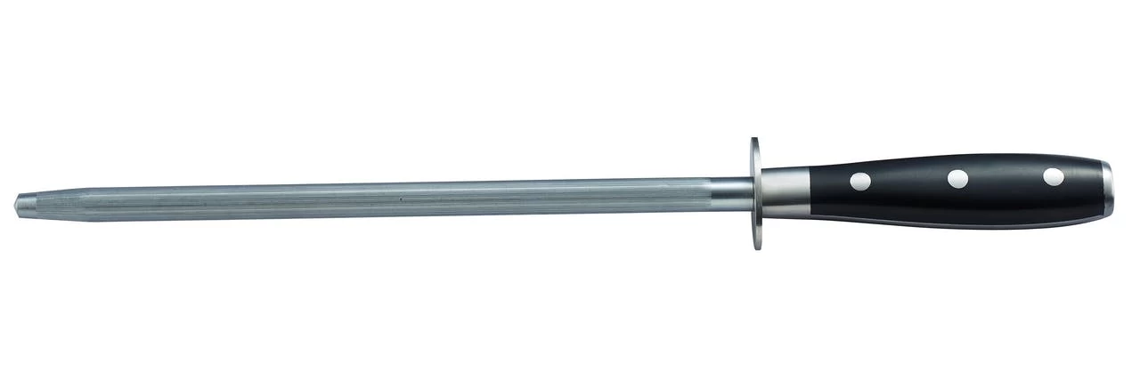 Der METRO Professional Wetzstahl Expert mit einer Klinge aus Molybdenum-Vanadium-Stahl ist leicht zu schärfen und verfügt über einen genieteten ergonomischen Griff. Das Messer hat ein Gewicht von 341 g und eine Klinge von 250 mm lang.
