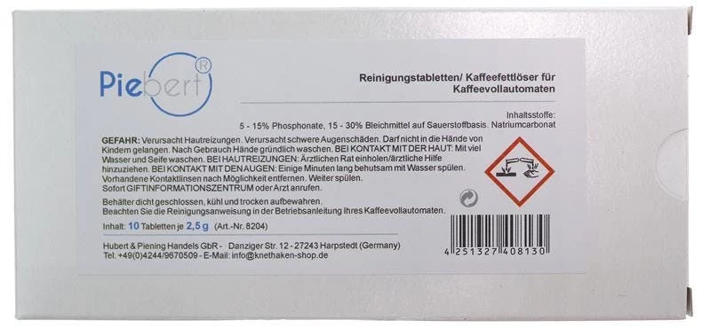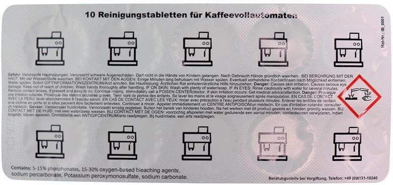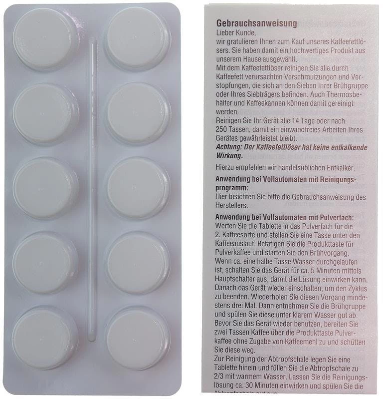 10 Reinigungstabletten im Blister mit Anleitung für Kaffeevollautomaten (speziell für das automatische Reinigungsprogramm) • Verpackt in einer wiederverschließbaren Schachtel • Durchmesser 18mm, Dicke 5mm, 2,5g je Kaffeefettlöser-Tablette • Die Reinigungstabs sind geeignet für viele Kaffeevollautomaten, Siebträger, Padmaschinen oder Kaffeekannen. • Z.B. für Jura, Siemens Eq-series, Bosch Vero series, Krups, Melitta, Saeco, Philipps, Wmf, DeLonghi, Neff, Nespresso, Miele, uvm! • Verwenden Sie die Kaffeefettlöser-Tabletten unter Einbezug der Bedienungsanleitung Ihres Gerätes. In der Regel wird eine Tablette je Reinigungsvorgang in die Brühkammer (der Brüheinheit) gegeben und das Reinigungsprogramm am Gerät gestartet. Die meisten Kaffeevollautomaten besitzen ein vollautomatisches Reinigungsprogramm. Aufgrund der Größe passt die Tablette in jede gängige Brühkammer. Die Reinigungstablette löst unter heißem Wasser und Druck Kaffeefett optimal aus Ihrem Gerät!Inhaltsstoffe: 5-15% Phosphonate, 15-30% Bleichmittel auf Sauerstoffbasis, Natriumcarbonat.GEFAHR: Verursacht Hautreizungen. Verursacht schwere Augenschäden. Darf nicht in die Hände von Kindern gelangen. Nach Gebrauch Hände gründlich waschen. BEI KONTAKT MIT DER HAUT: Mit viel Wasser und Seife waschen. BEI HAUTREIZUNG: Ärztlichen Rat einholen / ärztliche Hilfe hinzuziehen. BEI KONTAKT MIT DEN AUGEN: Einige Minuten lang behutsam mit Wasser spülen. Vorhandene Kontaktlinsen nach Möglichkeit entfernen. Weiter spülen. Sofort GIFTINFORMATIONSZENTRUM oder Arzt anrufen.
