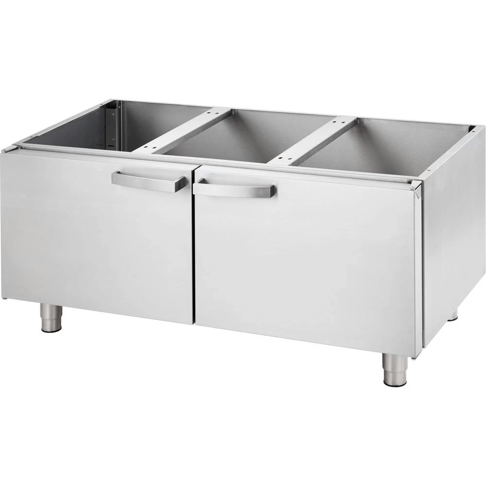 Der verstärkte, präzise gearbeitete Unterbau wird von standfesten, höhenverstellbaren Füße sicher getragen und ist dreiseitig mit einer Edelstahlplatte verkleidet. Ihre Kochgeräte und Neutralelemente können Sie mühelos passgenau in die Oberseite einsetzen.