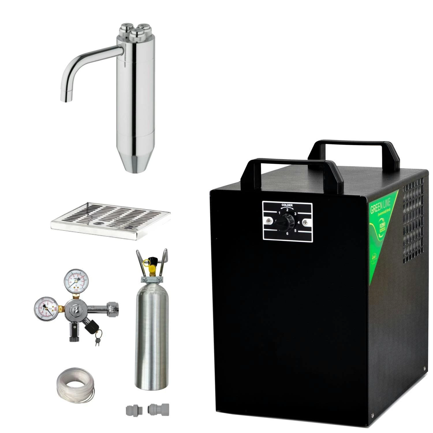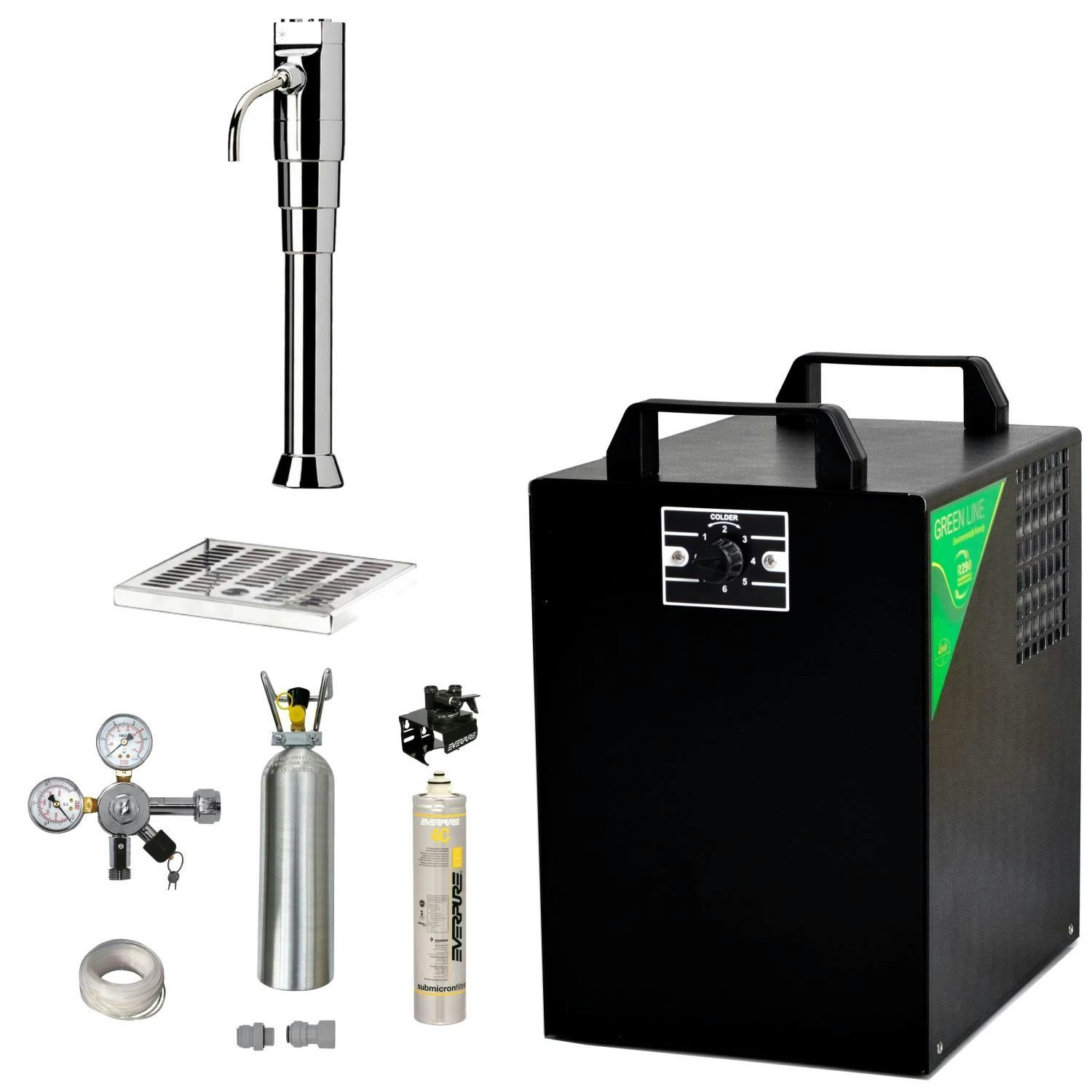Die Wasserausgabe erfolgt über eine im Angebot enthaltene Schanksäule, welche nach eigenen Vorlieben ausgewählt werden kann. Das Sprudelwassergerät wird mit einem Abtropfkasten inklusive herausnehmbarem Tropfblech geliefert. Außerdem im Set enthalten sind ein Druckminderer mit Arbeits- und Inhaltsmanometer, eine 2 kg CO2 Kohlensäureflasche und das benötigte Montagezubehör. Mit der 2kg CO2-Flasche können 300-400 Liter Sprudelwasser gezapft werden. Die wiederbefüllbaren Flaschen können getauscht werden, sobald diese leer sind.